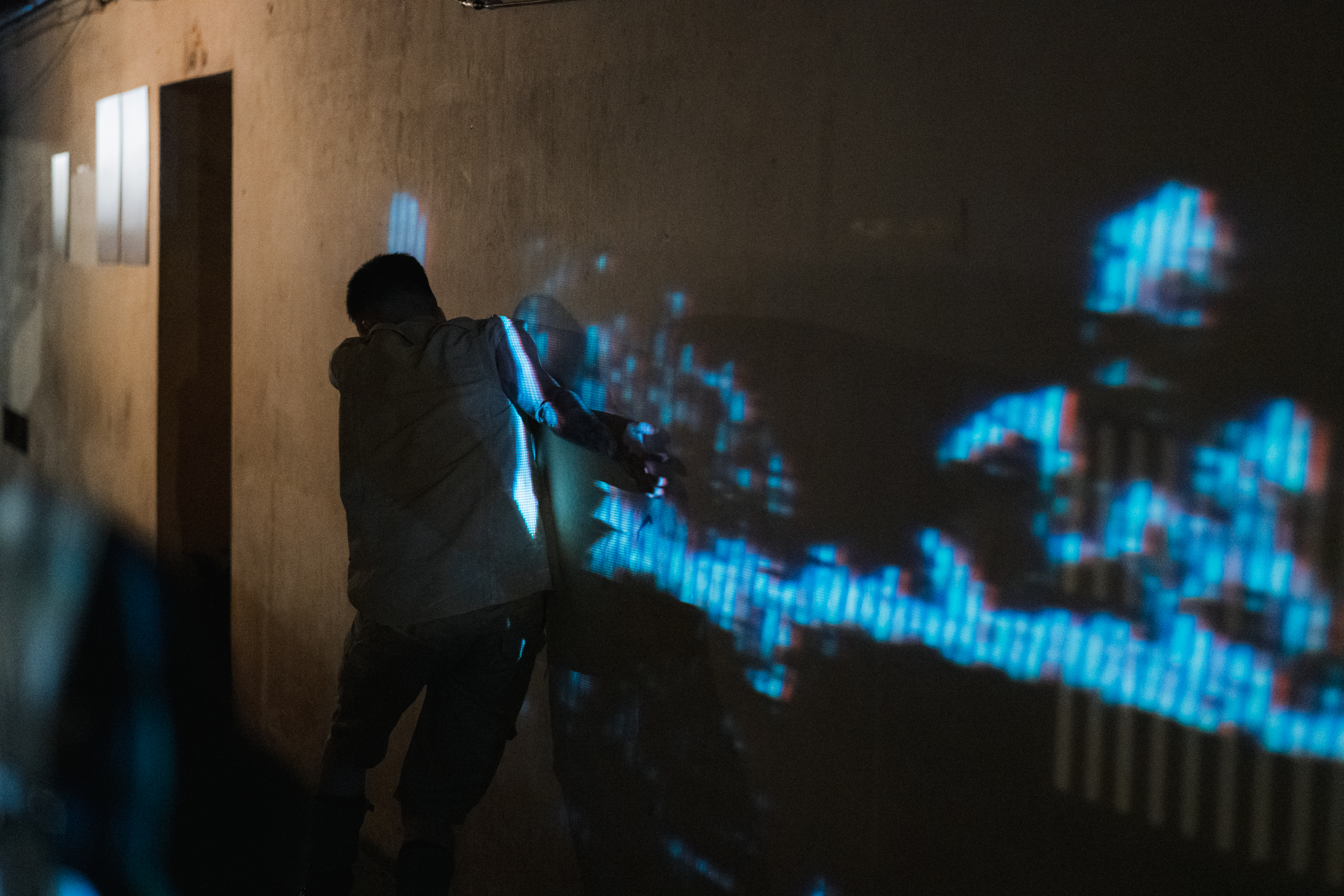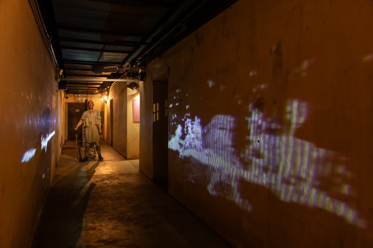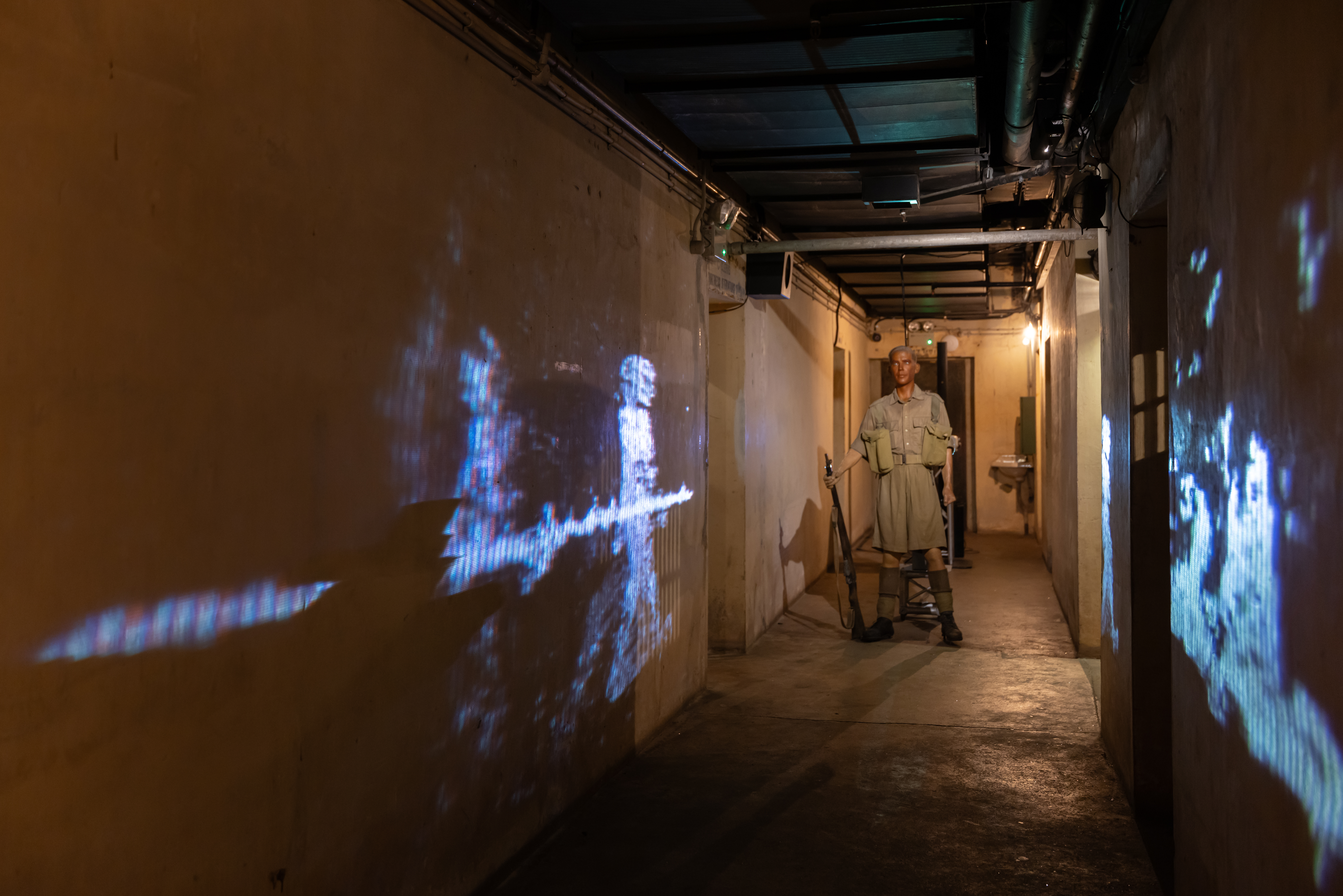 Site-specific InstallationSet in the subterranean corridors of Singapore’s historic Battlebox, In Flux reimagines this WWII-era bunker as a nexus of time where past, present, and future converge. A projector dynamically casts images along the corridor walls, blending scenes of British colonial officers at the brink of surrender, present-day visitors captured by motion-tracking sensors, and predictions of future movements derived from real-time data.
