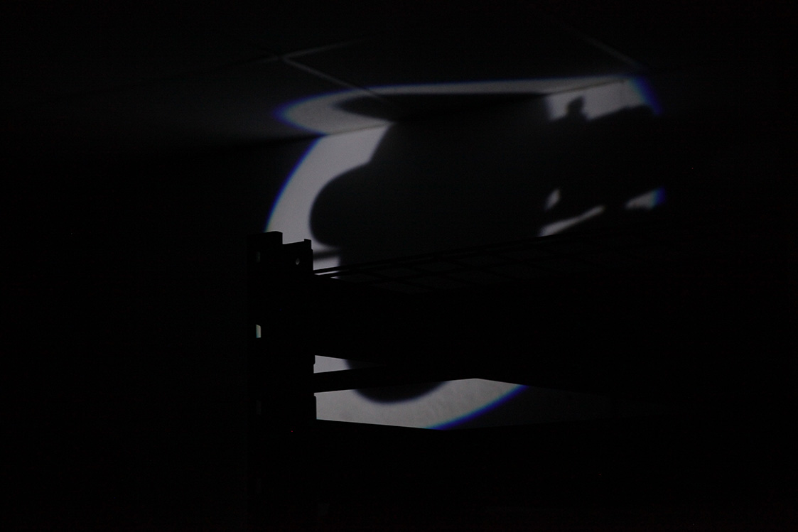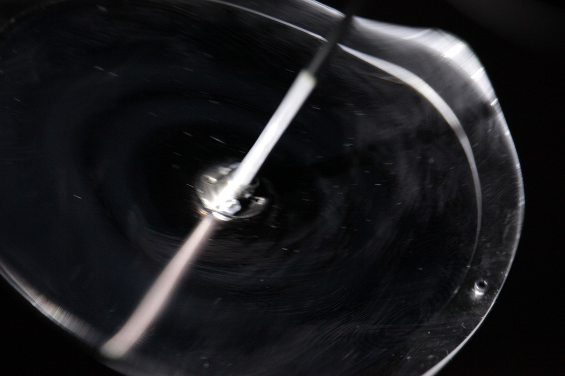 The nano-etched 6” silicon wafer is experienced indirectly, through a large concave mirror that turns the wafer into a floating, magnified, kinetic apparition. The wafer is mounted on the end of a slender black metal rod, positioned 300 mm in front of a 600 mm diameter concave mirror. When a viewer stands in front of the mirror and looks toward its center, they do not look at the wafer itself but at a virtual image: a magnified, suspended disc of nano-lensing texture that hovers optically in front of the wall.