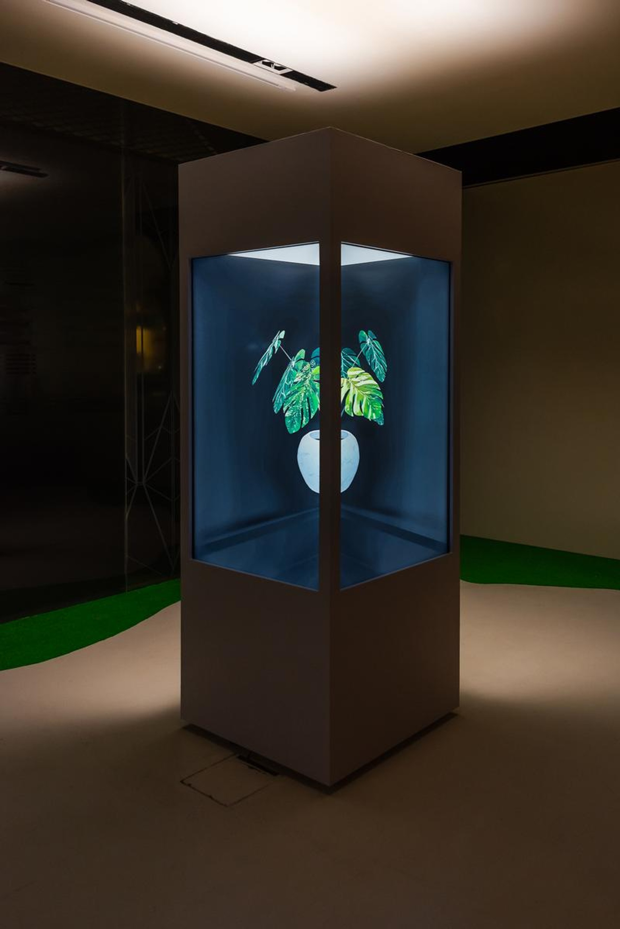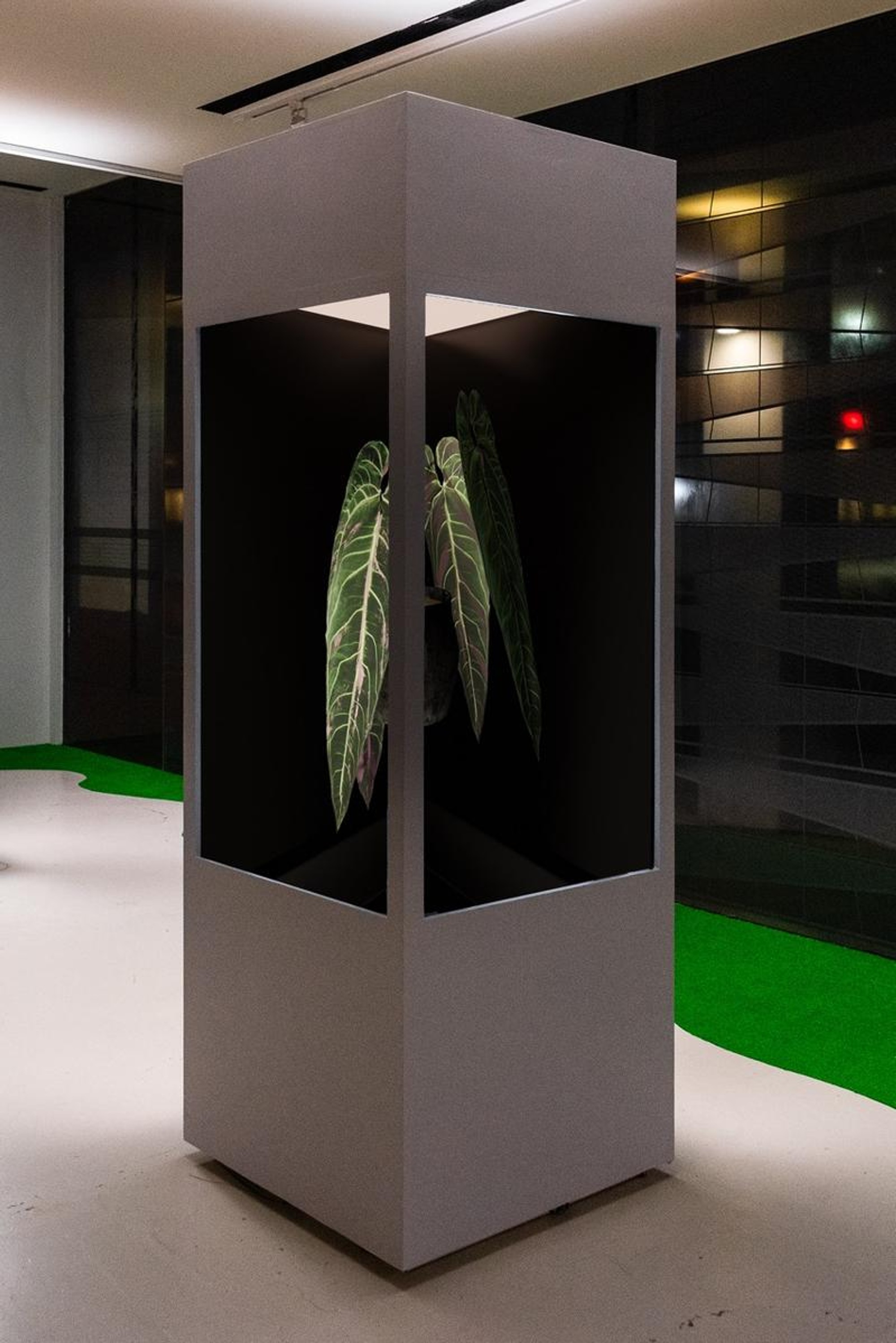 Two 55 inch LED TV, Philodendron Billietiae, Anthurium Warocqueanum, Monstera Deliciosia Albo var. Borsigiana, Custom Acrylic and Wood Structure, 3-channel audio, 85 x 85 x 210cm.